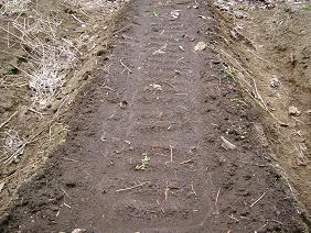 畝に2条まきしました。土をかけて鎮圧、水やり。